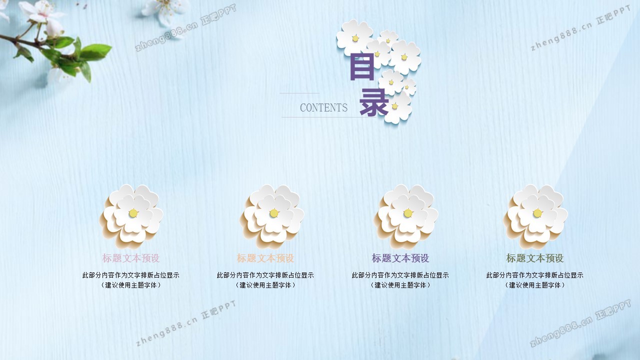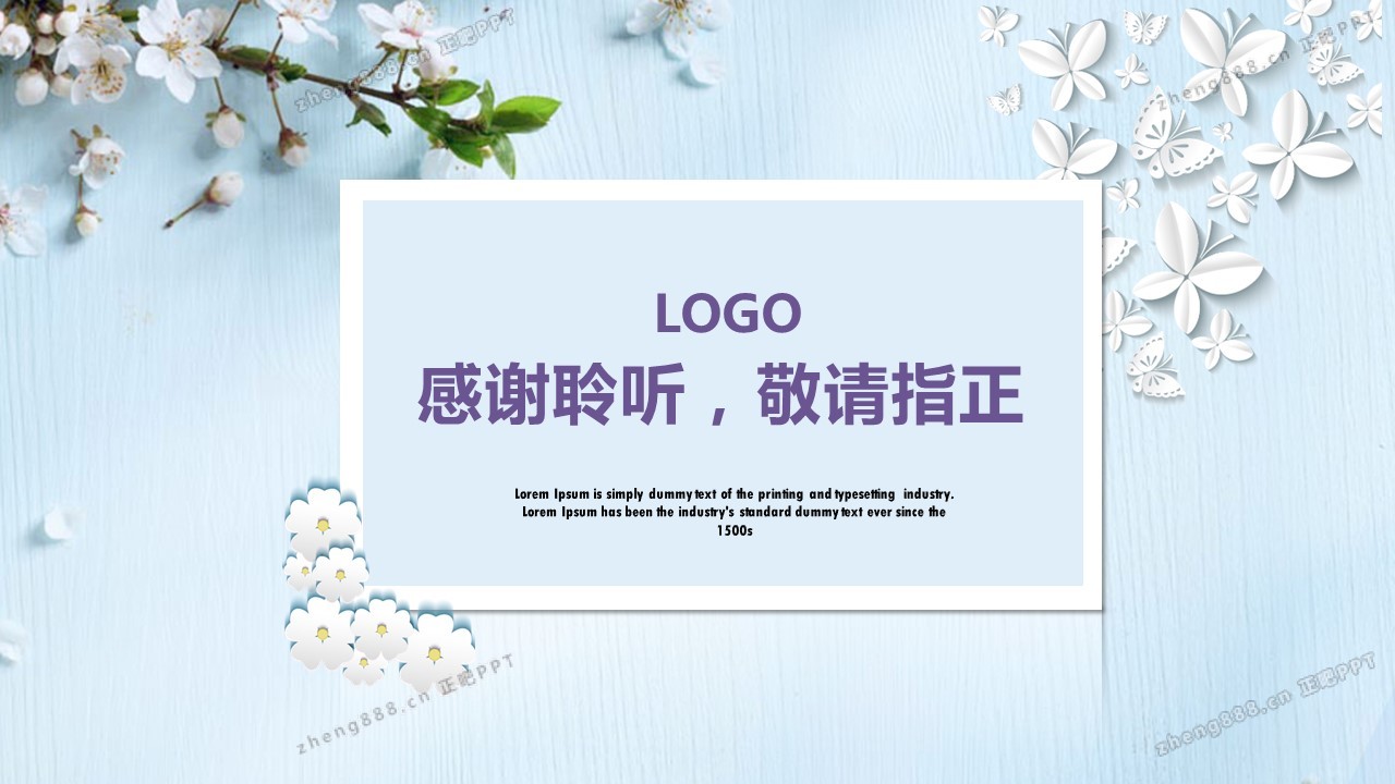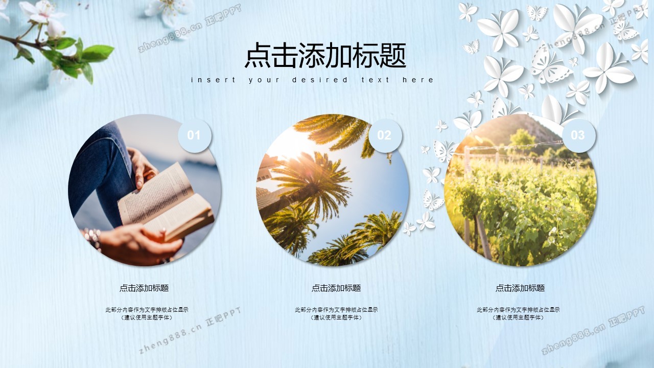 浅蓝清新桃花蝴蝶微立体述职报告PPT模板