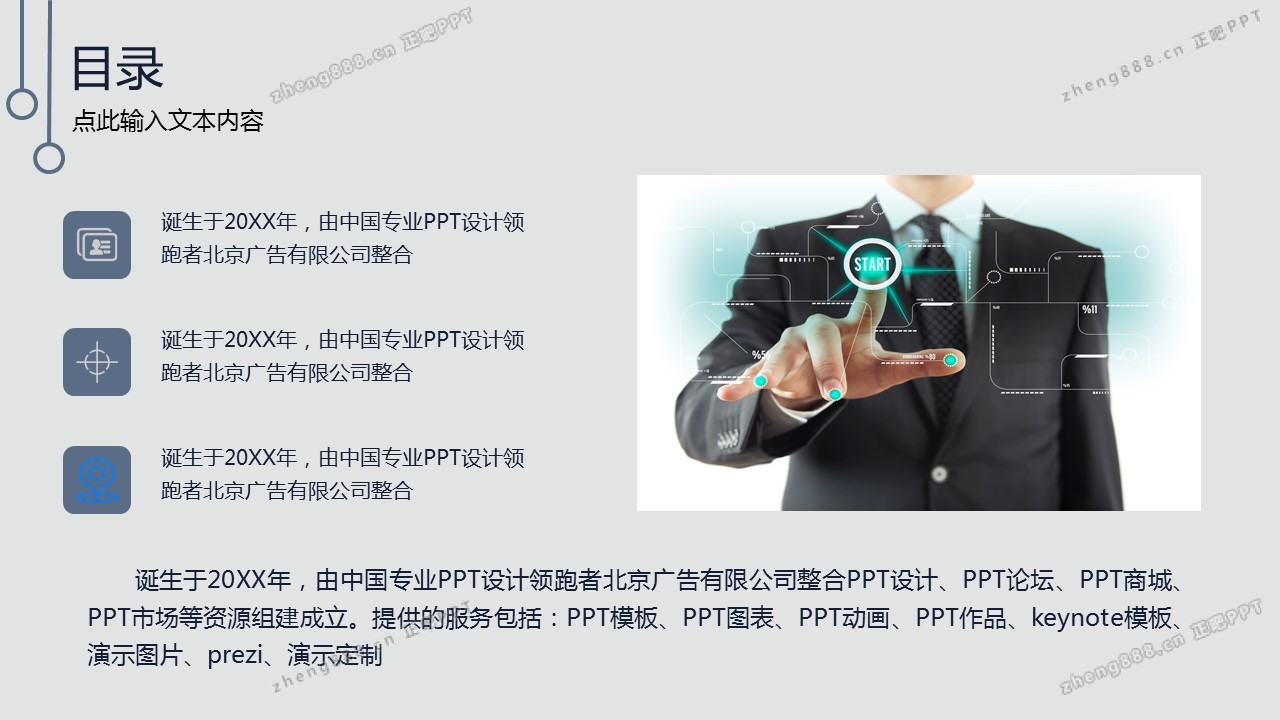 欢迎您访问【正吧PPT】,我们致力于为设计师和泛办公人群提供分享PPT作品。内容涵盖了商业策划、报告总结、教育培训、公务党建等方面的演示模板