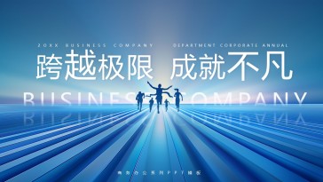 蓝色剪影背景“跨越极限成就不凡”商务办公通用PPT模板 20页