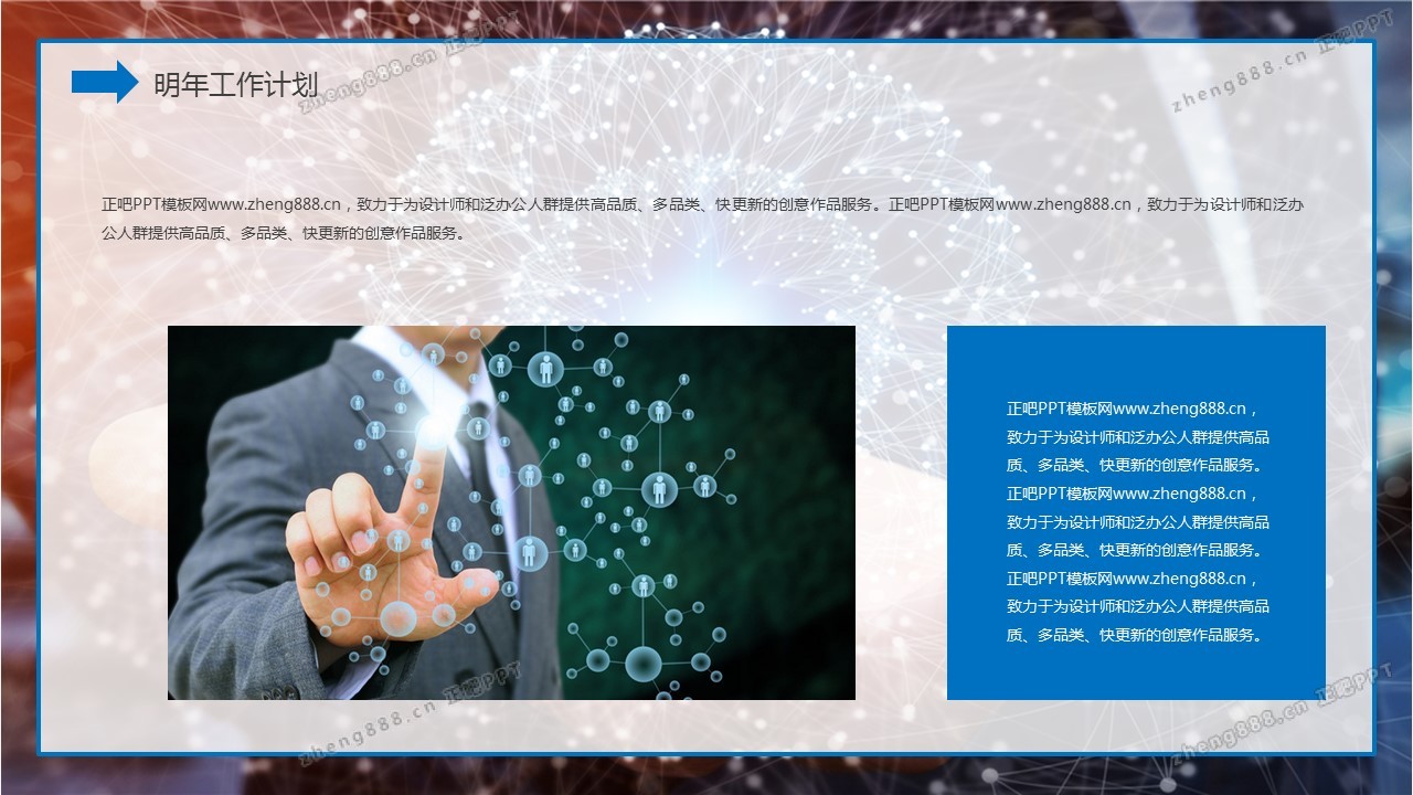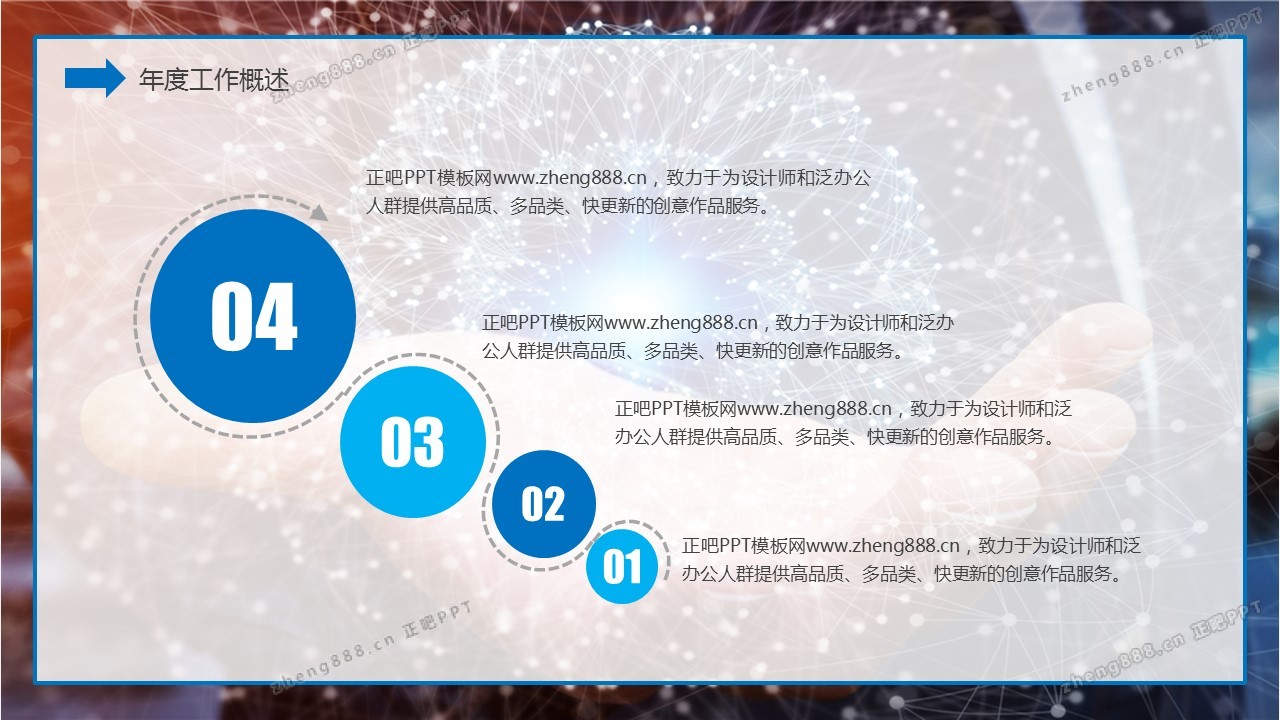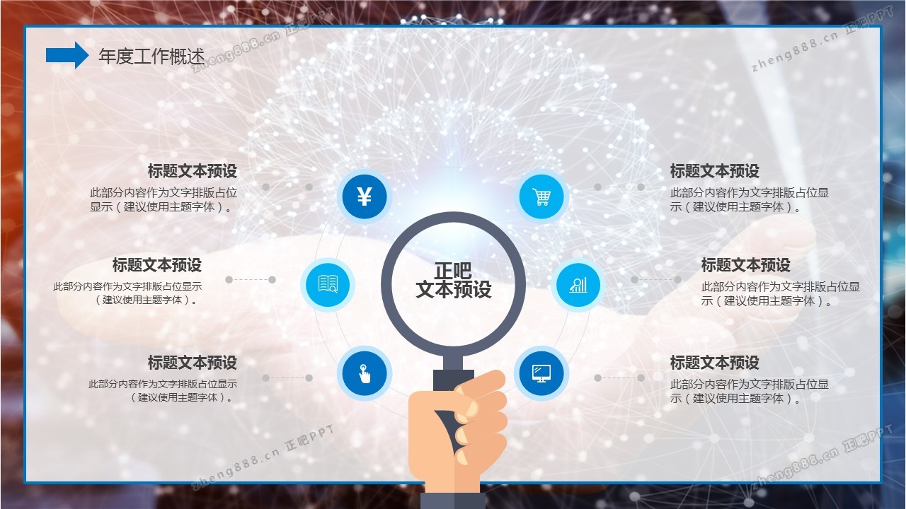 欢迎您访问【正吧PPT】,我们致力于为设计师和泛办公人群提供分享PPT作品。内容涵盖了商业策划、报告总结、教育培训、公务党建等方面的演示模板