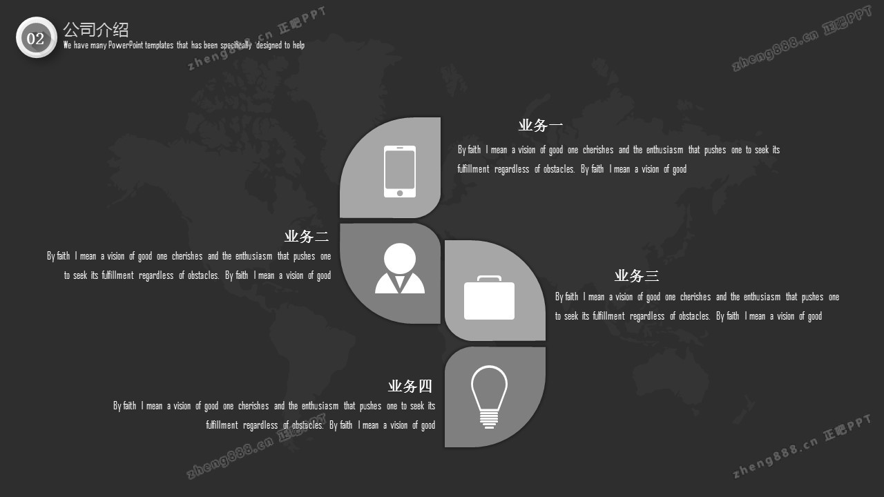 欢迎您访问【正吧PPT】,我们致力于为设计师和泛办公人群提供分享PPT作品。内容涵盖了商业策划、报告总结、教育培训、公务党建等方面的演示模板