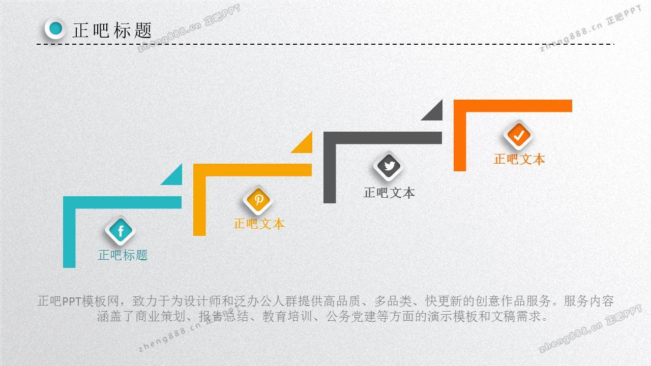 欢迎您访问【正吧PPT】,我们致力于为设计师和泛办公人群提供分享PPT作品。内容涵盖了商业策划、报告总结、教育培训、公务党建等方面的演示模板