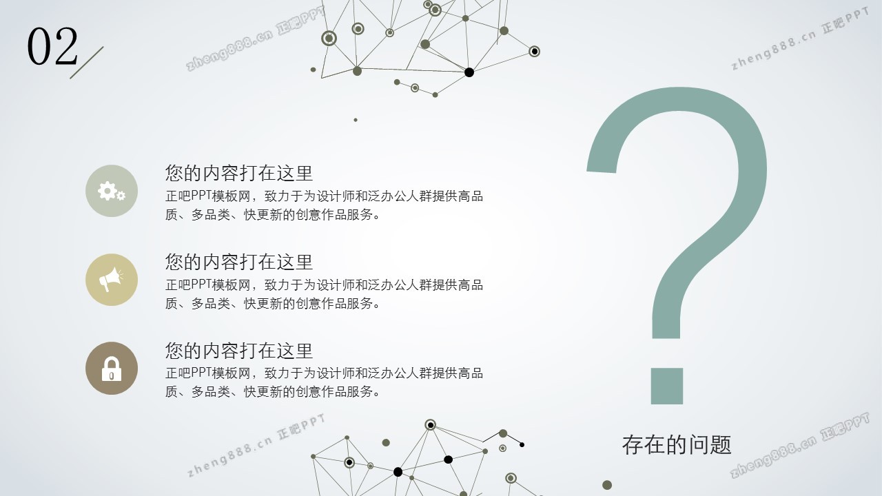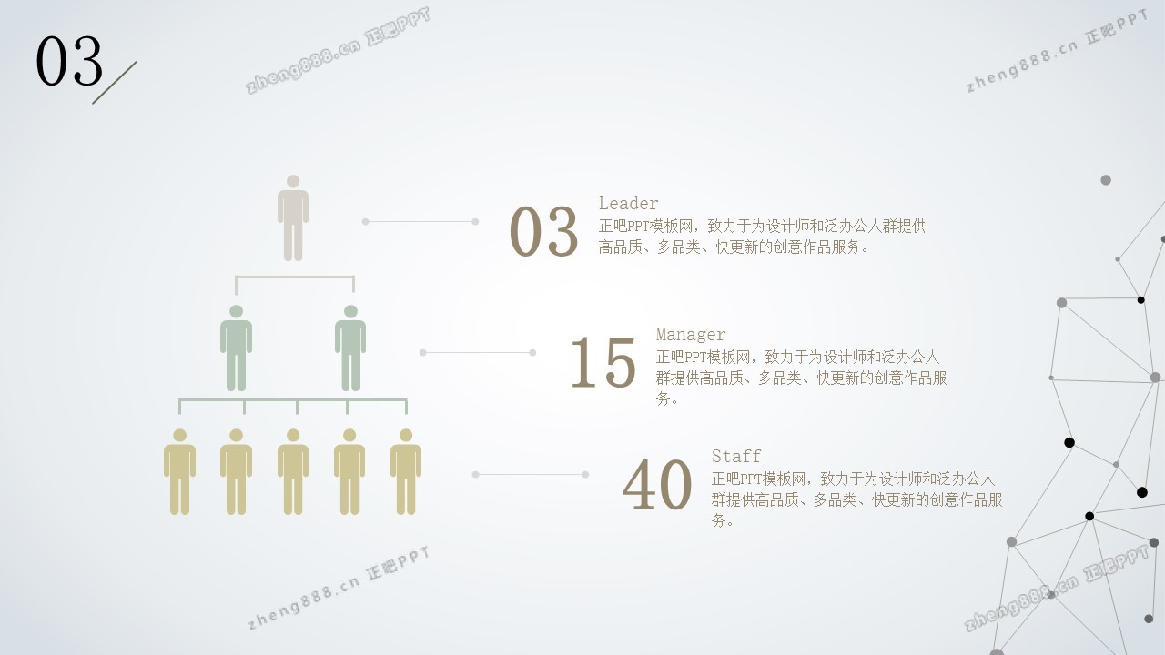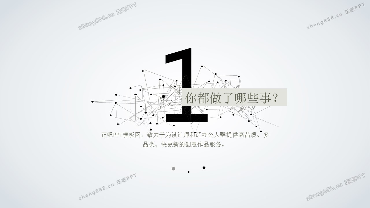 欢迎您访问【正吧PPT】,我们致力于为设计师和泛办公人群提供分享PPT作品。内容涵盖了商业策划、报告总结、教育培训、公务党建等方面的演示模板