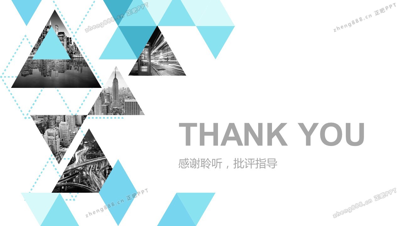 蓝色简洁三角形图片排版风格工作汇报PPT模板