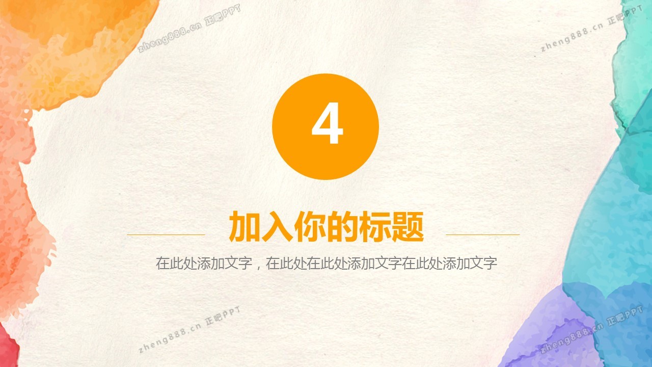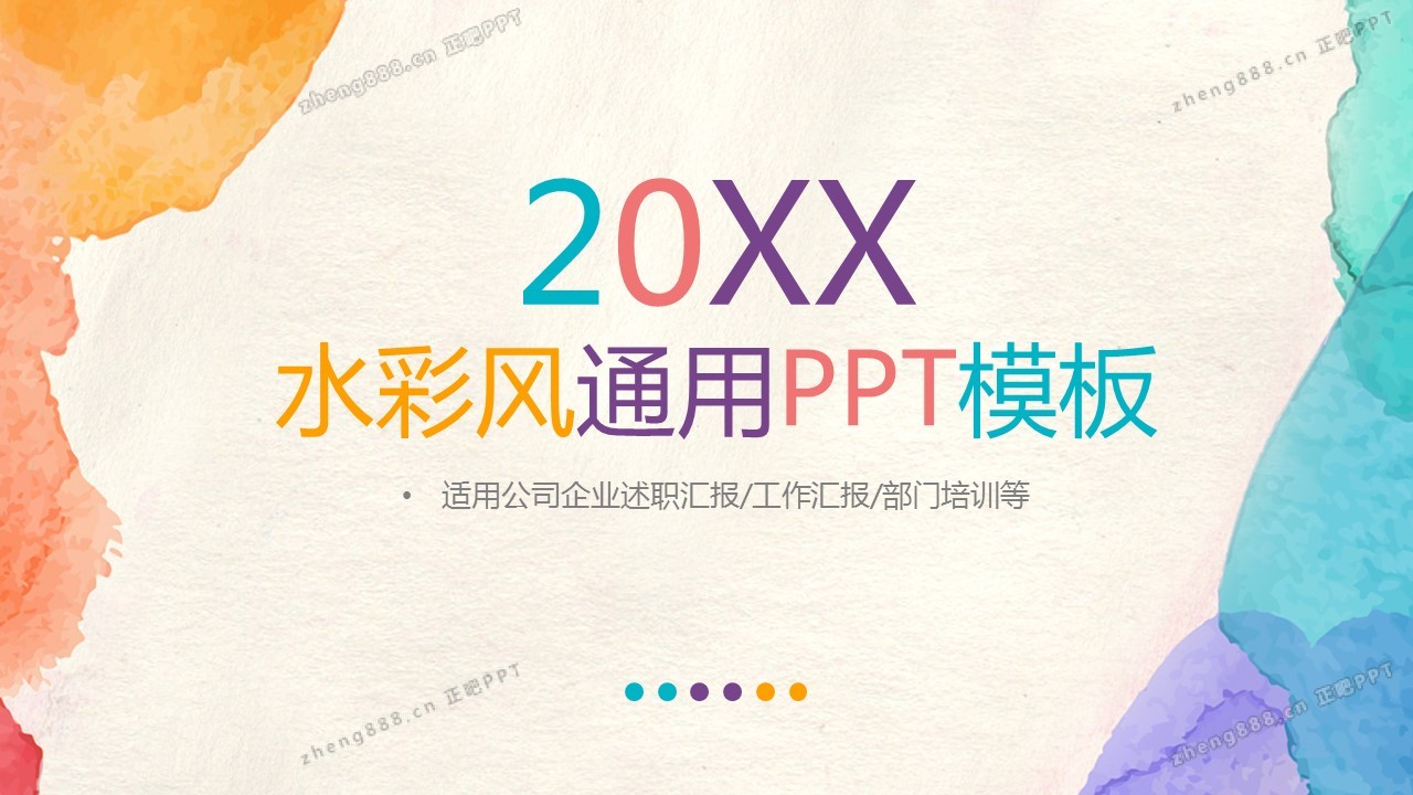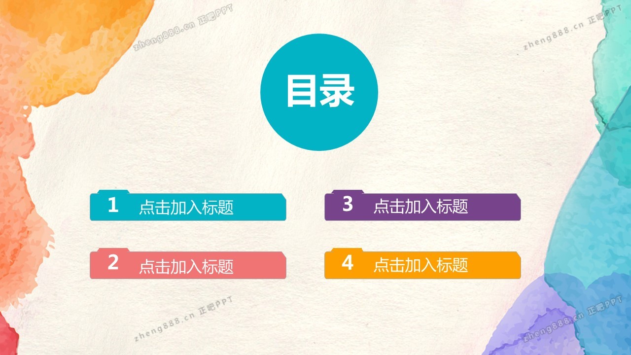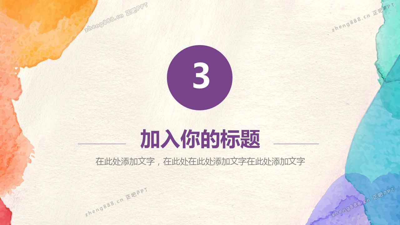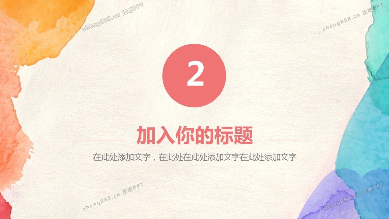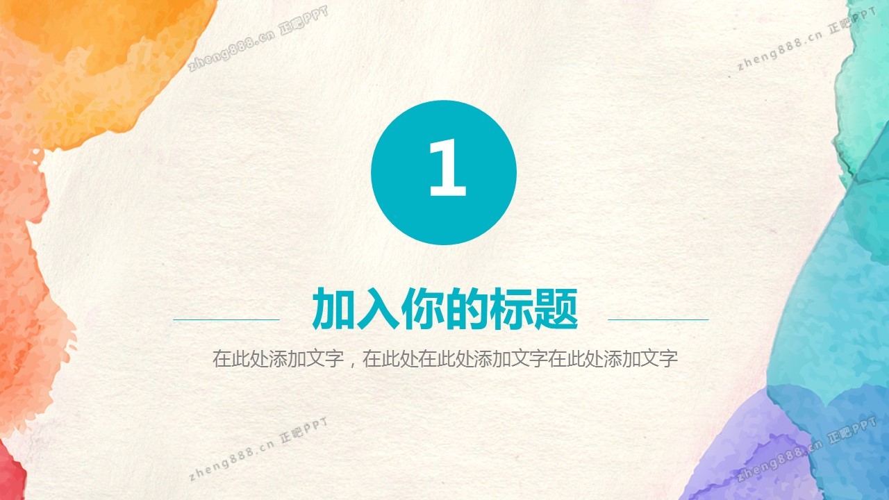 彩色水彩印迹背景的扁平化艺术设计PPT模板