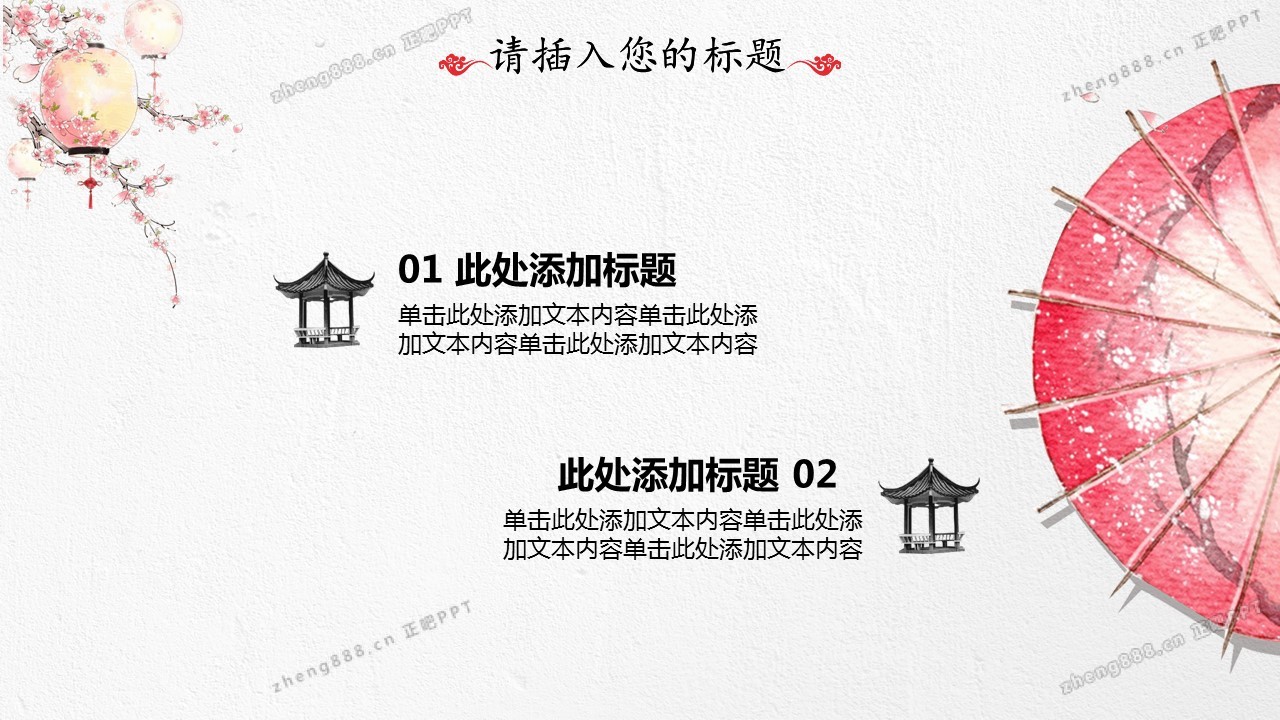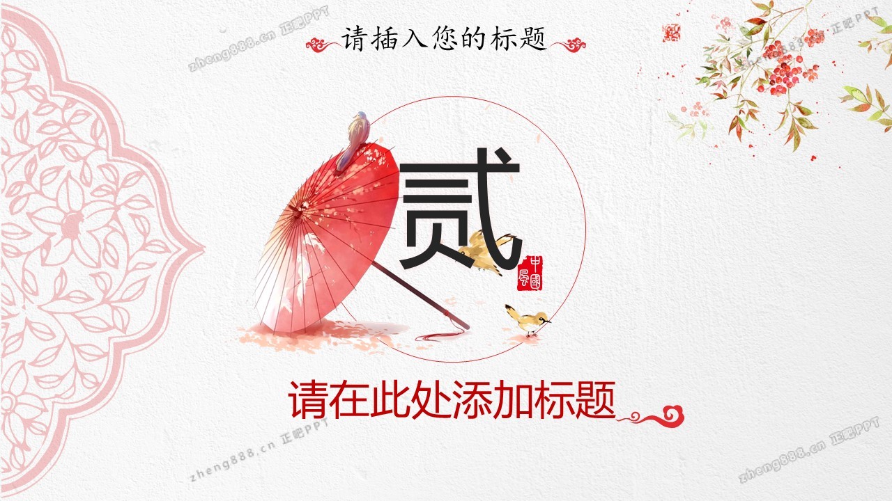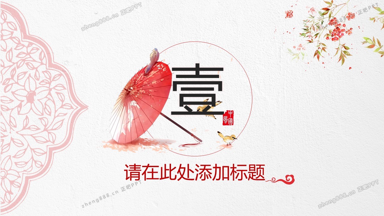 精致粉色古典雨伞花纹背景的唯美中国风PPT模板