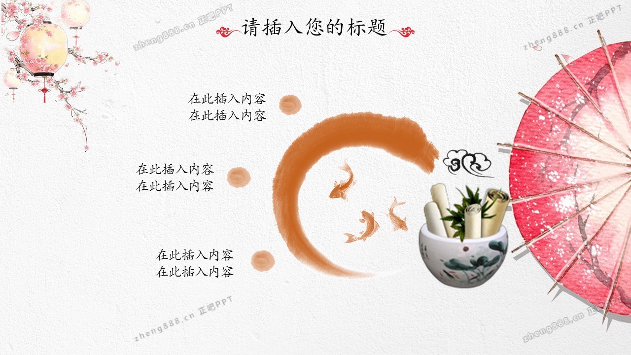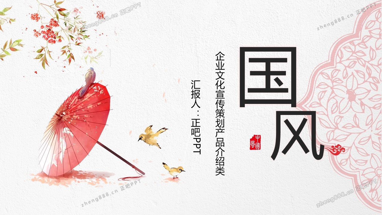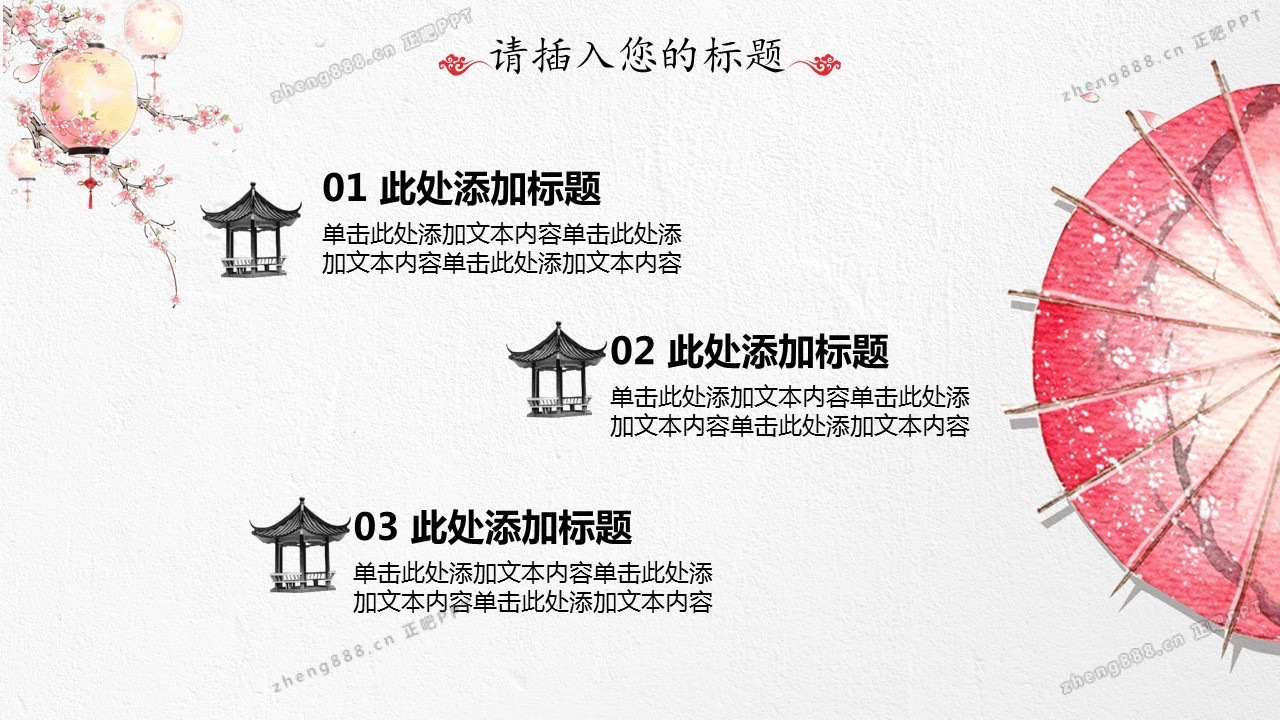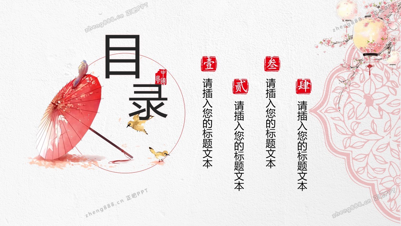 精致粉色古典雨伞花纹背景的唯美中国风PPT模板