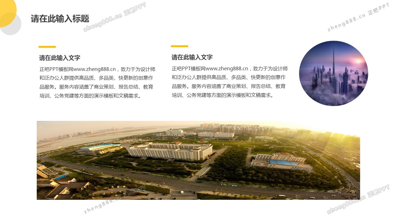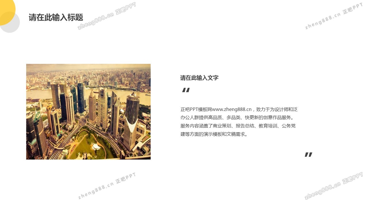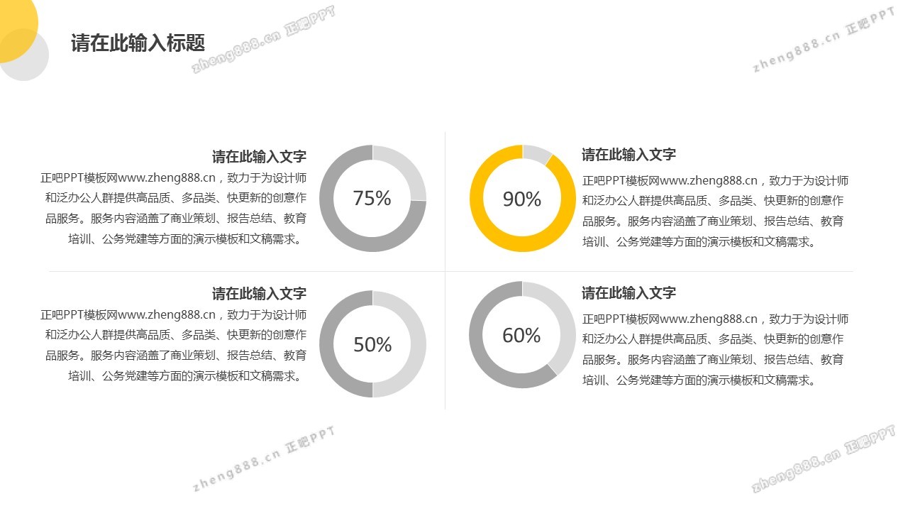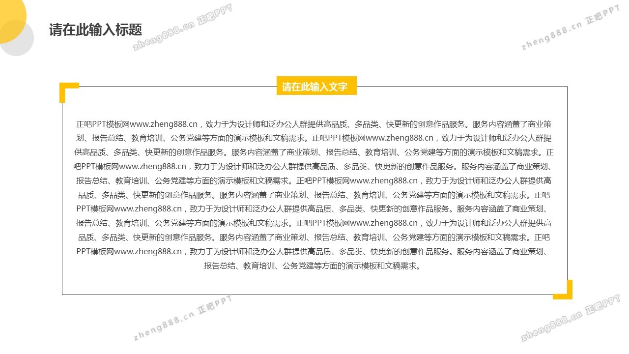 欢迎您访问【正吧PPT】,我们致力于为设计师和泛办公人群提供分享PPT作品。内容涵盖了商业策划、报告总结、教育培训、公务党建等方面的演示模板