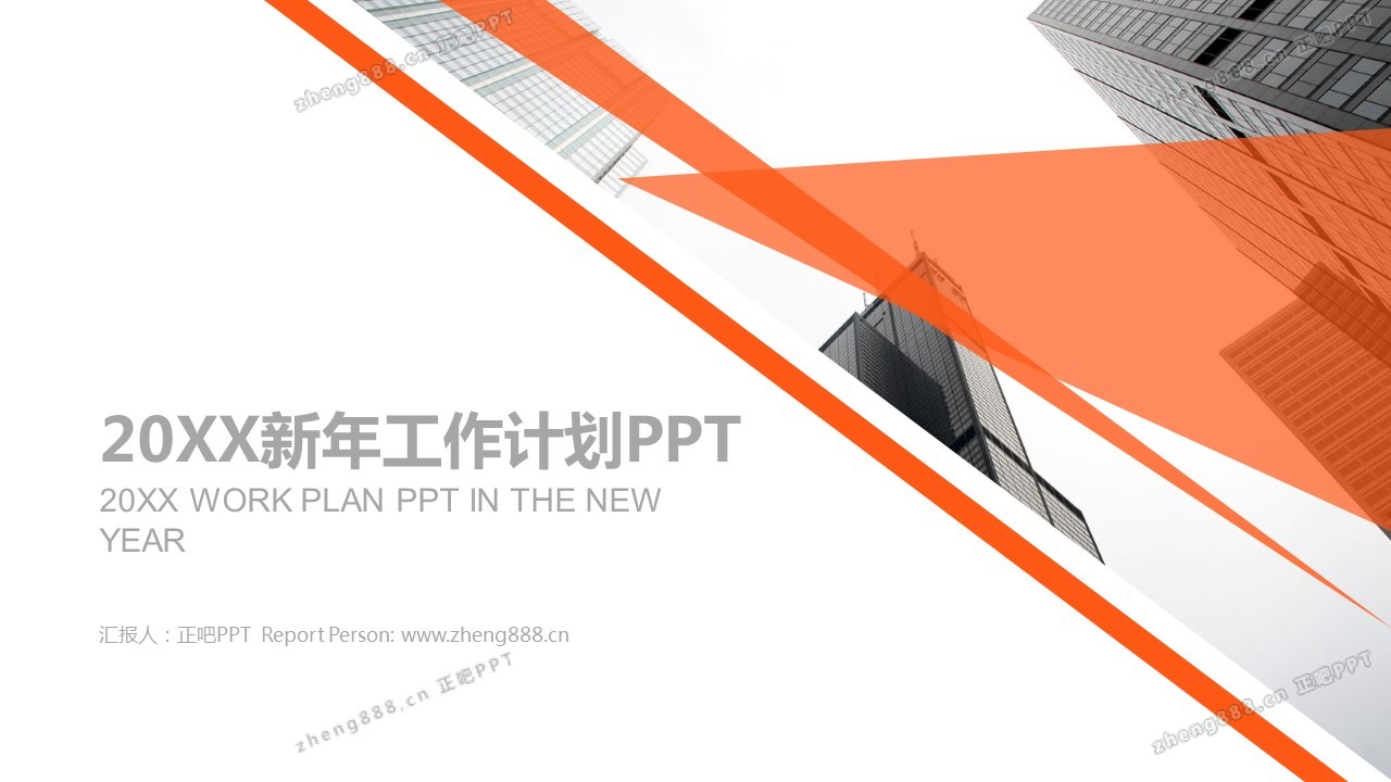 橙色多边形与现代化建筑背景的工作计划PPT模板
