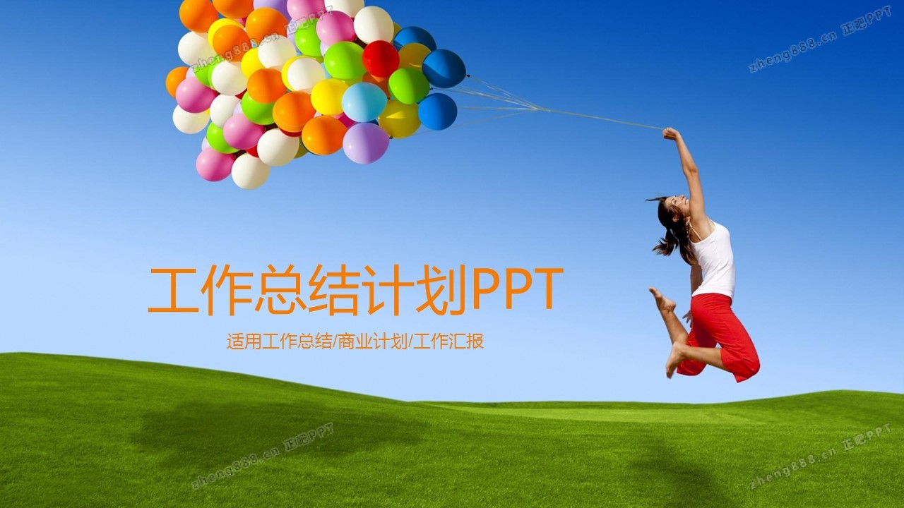蓝天白云草地上跳跃的女孩背景幻灯片模板