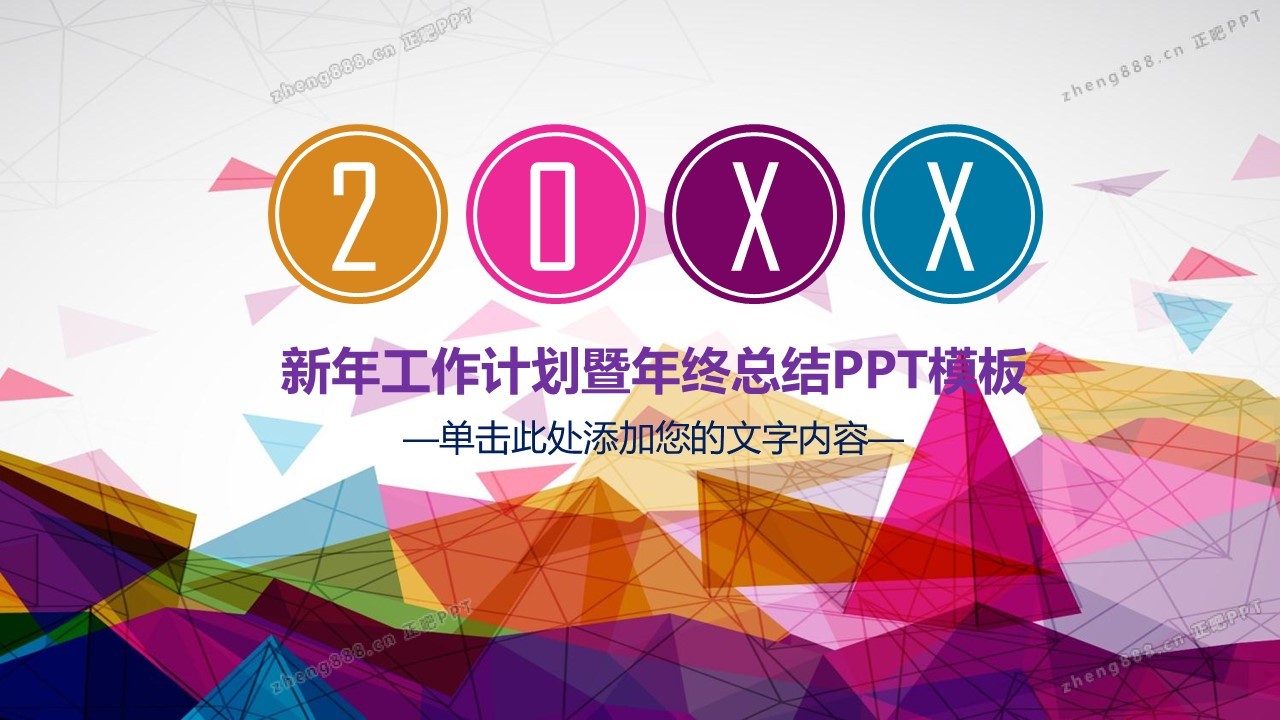 彩色炫酷多边形背景的新年工作计划PPT模板